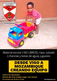 Abrimos nuestra campaña solidaria de navidad un año más para llevar algo de felicidad a nuestros niños de Beira (Mozambique). Lo que necesitamos en el cartel lo tenemos reflejado. No pedimos libros porque su idioma oficial es el portugués. Los juguetes, a poder ser, sin pilas, porque luego allí es difícil encontrarlas. Y si tenéis ropa deportiva, balones, botas que ya no os sirvan os aseguramos que ellos se mueren por el fútbol.