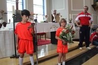 Comenzamos con la tradicional Ofrenda floral en la cual dos representantes de cada equipo ofrecen a María Auxiliadora ( patrona de los Salesianos) un ramo de flores para agradecer el trabajo de toda la temporada y los éxitos cosechados y donde nuestros chic@s aprovechan para agradecer el trabajo y los valores que sus entrenadores han intentado inculcarles.